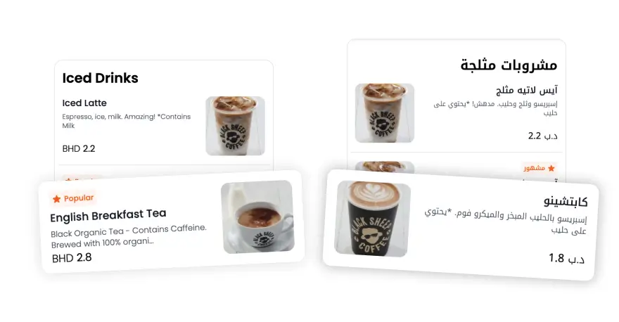 Menu available in multiple languages for international visitors. Share your menu easily via social media, website, or QR code, letting guests explore every item visually and understand details instantly.